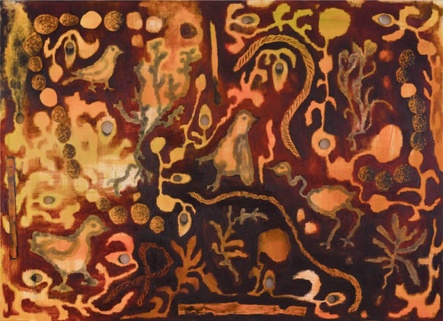 A line emerges from the burnt hole. Who is it? A snake? Are you sure that I called your name? The snake crawls toward the burnt holes, swallowing them one by one. Perhaps the snake was hungry and came over to eat a few eggs. I can paint a bird that will lay a few fresh eggs instead of the ones devoured. Perhaps this time a snake will not appear, maybe I will not light another fire. I will draw water just to be on the safe side.