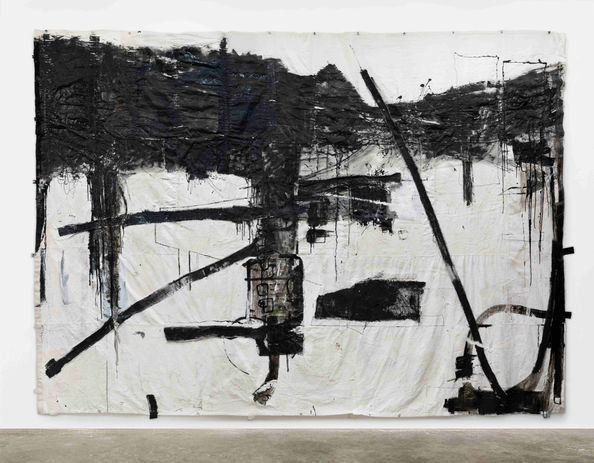 The work Echo (2024), made on sukkah sheets, combines different layers of work: conceptual use of a readymade surface, with its myriad signs and imprints, and the expressive work thereon. The bottom part of the work shows conspicuous signs of creasing, at times resembling a theatrical curtain which hides an event taking place behind it. Next to them, one may identify the application of paint at varying degrees of dilution and absorption, ranging from watercolor transparency to opaqueness, including spattered industrial paint, which creates drawn lines. External, bandage-like straps of fabric, combined into the surface, echo and momentarily replace the very act of painting in a free movement between the two-dimensional and the three-dimensional.