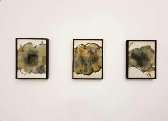 רצף העבודות בתערוכה מציעות התבוננות איטית, המבקשת מן הצופה להיכנס אל מצב שבו חרדה ונחמה מתקיימות יחד כמצב קיומי אחד. מתוך ההשהיה הזו הולך ומתגלה דימוי הענן כמרחב סף, מקום שבו המראה אינו מתמצה בראייה, והחומר נושא נוכחות מורכבת. העננים מרחפים כמצבים תודעתיים מתמשכים, הנעים בין כובד לשקט, בין התכנסות פנימית להשהיית המבט. הם מופיעים כסימני מים: עקבות של מים שטרם ירדו, כמעין של מי תהום עליונים, מאגר סמוי המרחף בין שמיים לארץ. בדומה לסימן מים בנייר, זהו חותם עדין וחבוי, שבו המים מסמנים את החומר בנוכחות שקטה ומתמשכת.